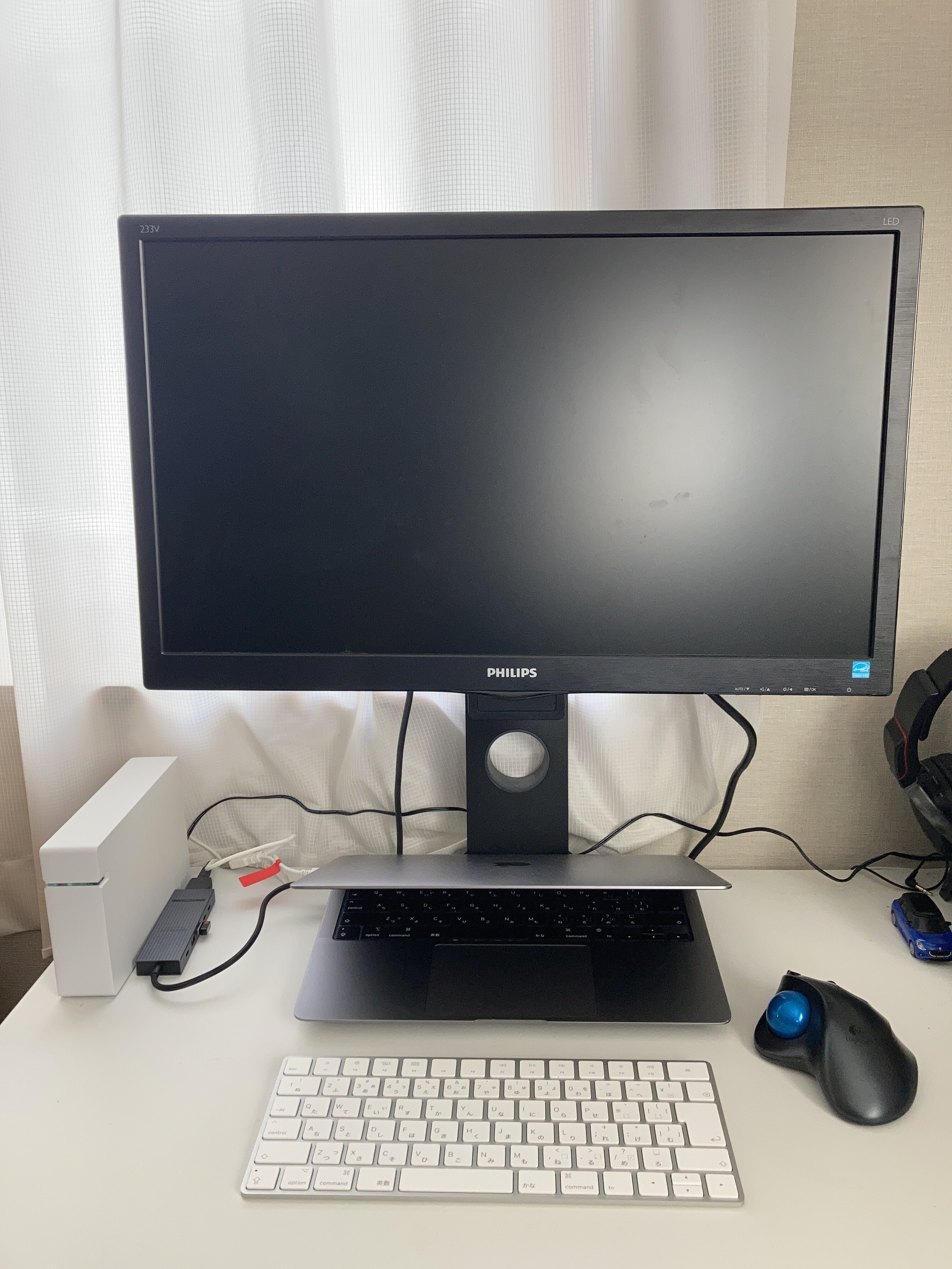 マウスは今までMacで使用していたLogicoolのトラックボールのマウスに、キーボードは、Lightningケーブルで充電のMagic Keyboard、HDD1台はTime machineバックアップ用に設置しました。データ関連は作業後は、BUFFALOのNAS LinkStationの方に保存するようにすることで、SSDが256GBでも十分対応できるようにします。